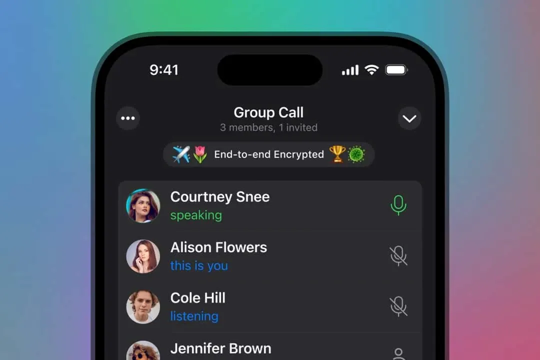 群组通话采用端到端加密技术,确保通话安全。参与者可以通过比较屏幕上显示的4 个表情符号来确认这一点——如果所有表情符号都匹配,则通话完全安全